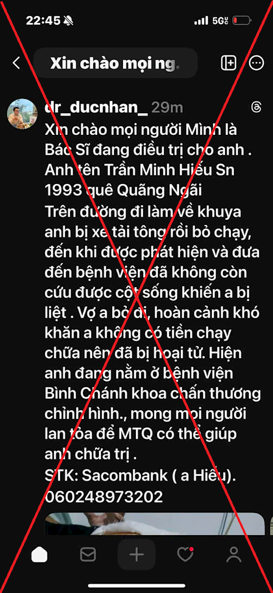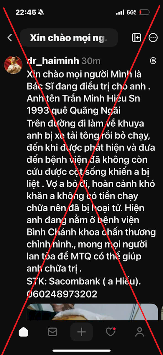 - Nội dung được người dùng tên tài khoản dr_ducnhan, dr_haiminh đăng tải trên trang mạng xã hội Threads: “Xin chào mọi người. Mình là bác sĩ đang điều trị cho anh. Anh tên Trần Minh Hiếu, sinh năm 1993, quê Quảng Ngãi. Trên đường đi làm về khuya, anh bị xe tải tông rồi bỏ chạy. Khi được phát hiện và đưa đến bệnh viện thì cột sống không còn cứu được nên anh bị liệt. Vợ anh đã bỏ đi, hoàn cảnh hiện tại rất khó khăn, không có tiền điều trị nên vết thương đã bị hoại tử. Hiện anh đang nằm điều trị tại Bệnh viện Bình Chánh – Khoa Chấn thương chỉnh hình. Mong mọi người lan tỏa để các mạnh thường quân có thể giúp anh chữa trị. STK: Sacombank (A. Hiếu) – 060248973202”.