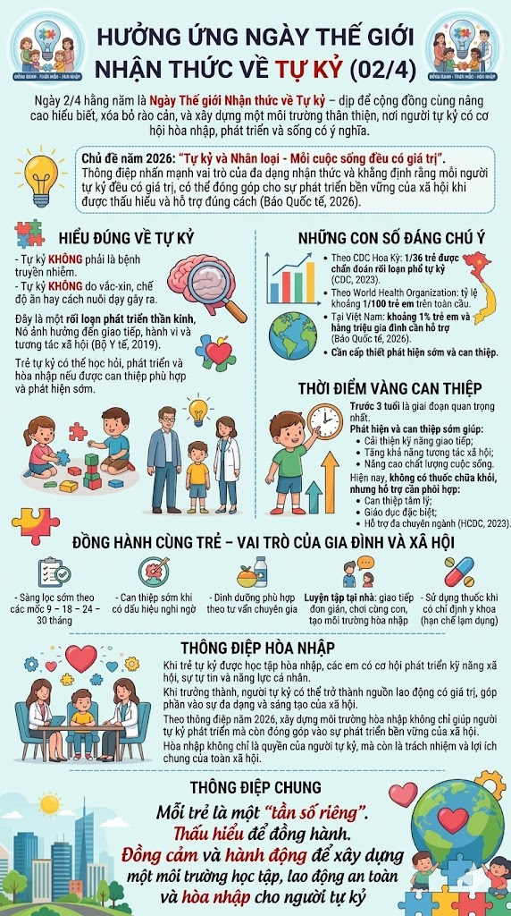 Báo Quốc tế. (2026). Ngày Thế giới nhận thức về tự kỷ 2026: Để mỗi cuộc sống đều có giá trị. https://baoquocte.vn/ngay-the-gioi-nhan-thuc-ve-tu-ky-2026-de-moi-cuoc-song-deu-co-gia-tri-376529.html
