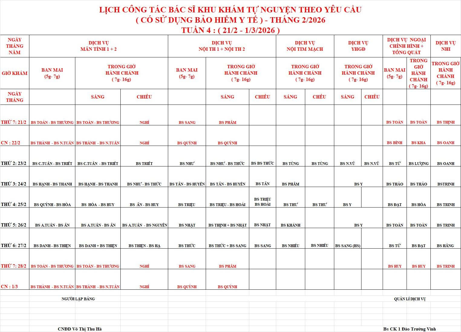 Lịch công tác bác sĩ khám khu tự nguyện theo yêu cầu ngày 21/02/2026-01/03/2026