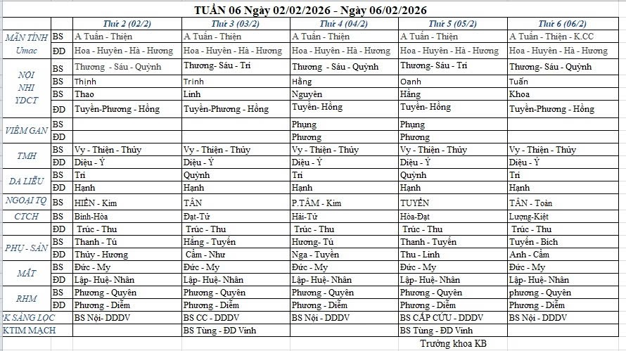 Lịch công tác bác sĩ khu khám ngoại trú 02/02/2026 - 06/02/2026