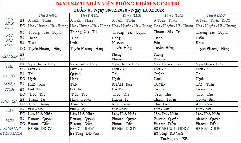 Lịch công tác bác sĩ khu khám ngoại trú 09/02/2026 - 13/02/2026