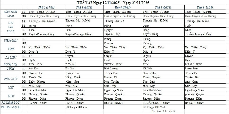 Lịch công tác bác sĩ khu khám ngoại trú 17/11/2025 - 23/11/2025