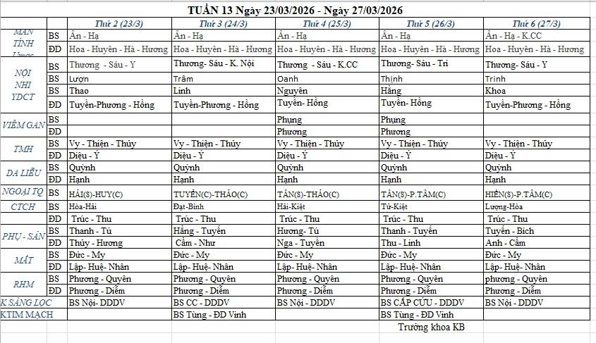 Lịch công tác bác sĩ khu khám ngoại trú 23/03/2026 - 27/03/2026